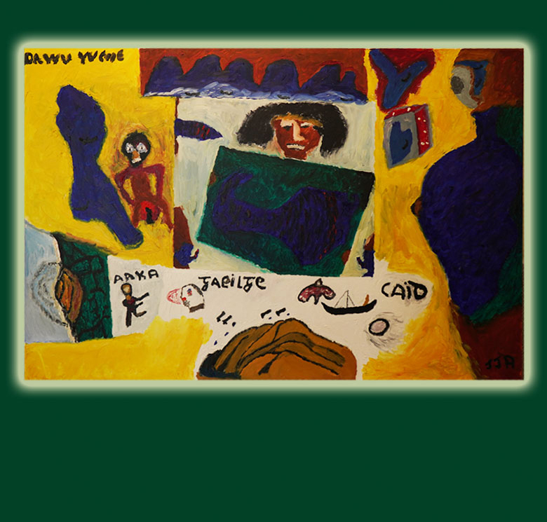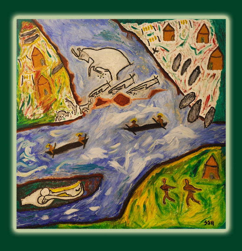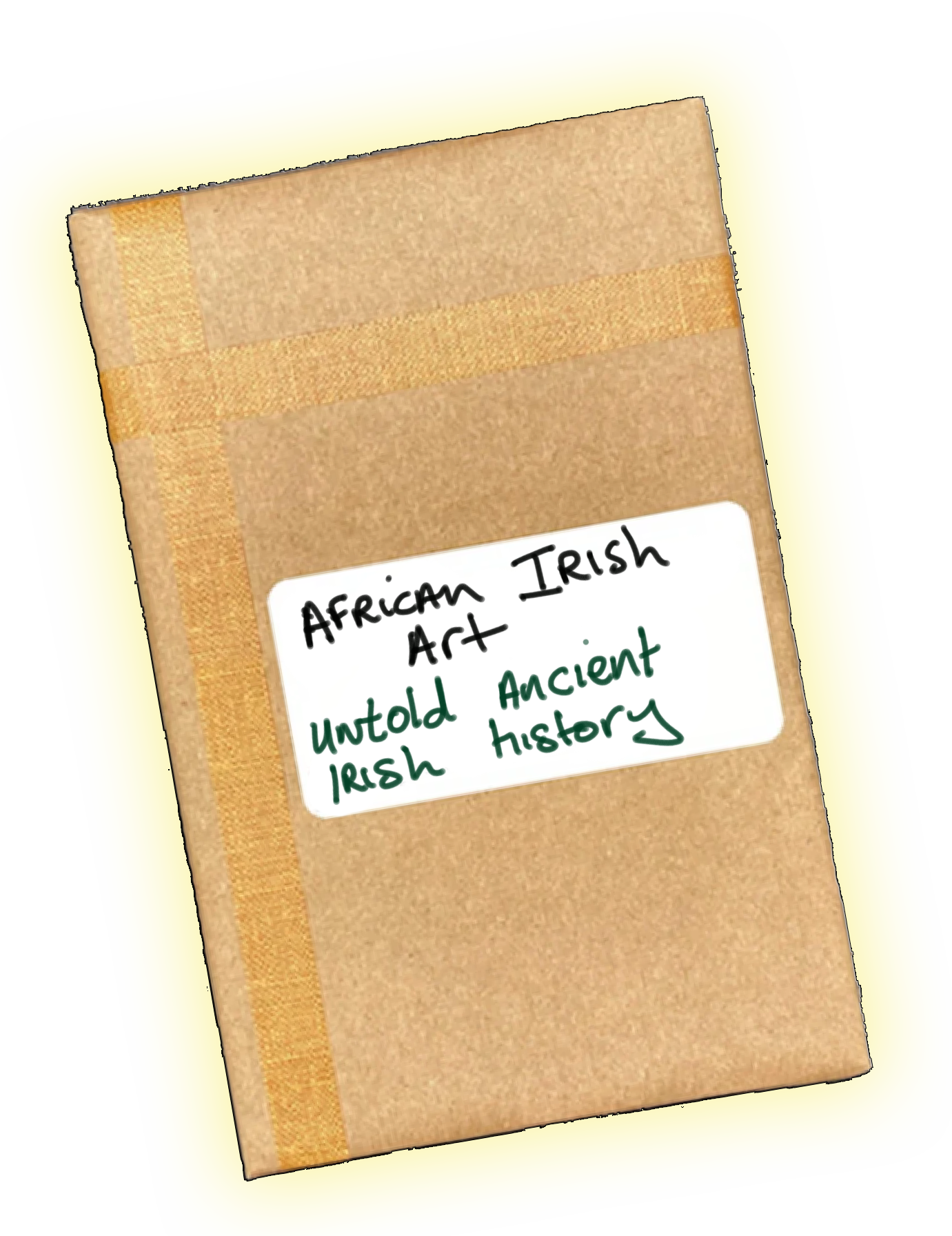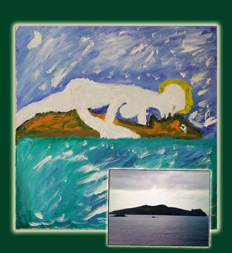 This illustration depicts various selected locations around the island of Ireland that were given names by Black Homo- Sapiens and whose names survive today. This caveman depiction is using bright colours from local plants and other wild growth. The following are the various locations and their original referencing can be found in the book: