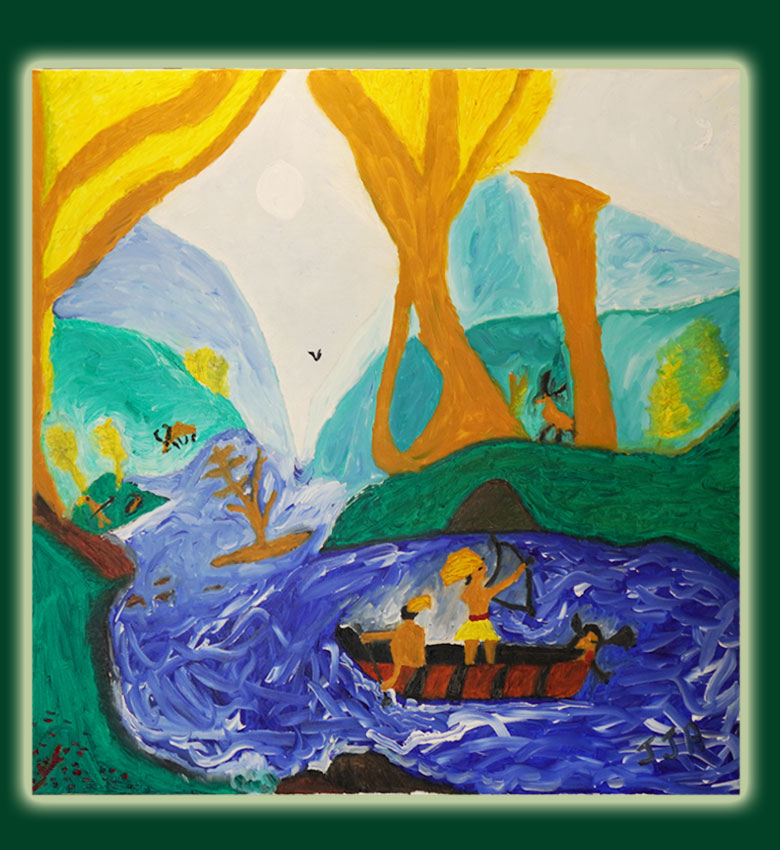 This illustration shows a tribe of men in flat boats and fishing and living along the river bank. It indicates the local Gandelow and Gaal fishing boat used along the shores of the Shannon Estuary.